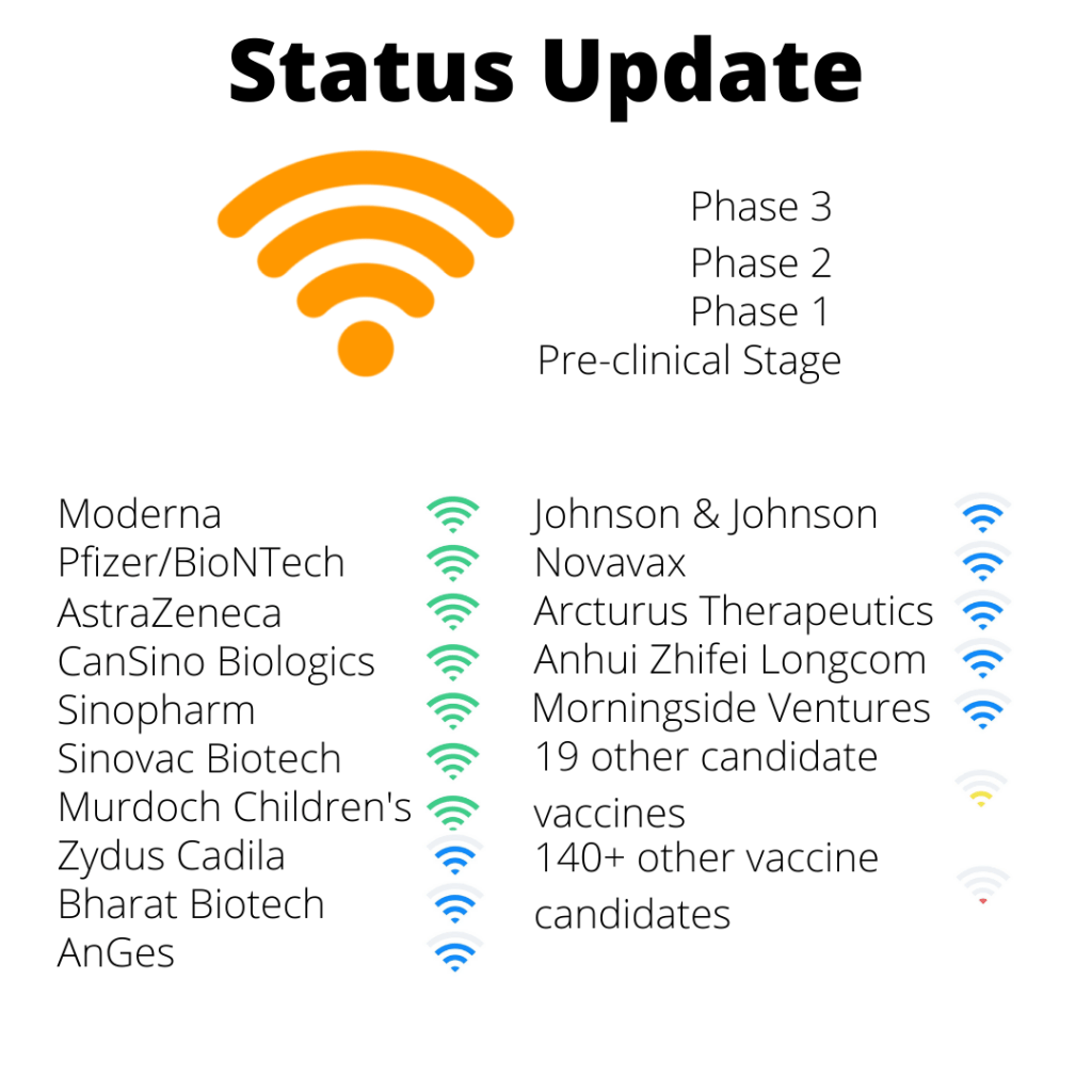 The New York Times reveals that as of July 24th, 2020, the leading candidate vaccines are being developed in the US, China, Europe, and India. American companies Moderna and Pfizer (partnered with German company BioNTech and Chinese company Fosun Pharma) are both entering Phase 3 of clinical trials. Chinese companies CanSino Biologics, Sinopharm, and Sinovac Biotech are also entering or already in Phase 3. The British company AstraZeneca and the Murdoch Children’s Research Institute in Australia have also entered Phase 3. Indian companies Zydus Cadila and Bharat Biotech as well as Japanese company AnGes have entered Phase 2 of clinical development in the search for a COVID-19 vaccine. Many other companies have entered Phase 2 as well, including Morningside Ventures, Arcturus Therapeutics, Johnson & Johnson, Anhui Zhifei Longcom, and Novavax. Jonathan Corum and colleagues with the New York Times also assert that there are 19 other candidate vaccines in Phase 1 trials and over 140 other candidates in the preclinical phase. All of these aforementioned companies are the major players in the worldwide race for an effective COVID-19 vaccine. In fact, NIH Director Francis S. Collins has stated that from the companies currently in Phase 3, including Moderna and Pfizer, he hopes to have an effective vaccine ready for manufacturing and distribution by the end of 2020.