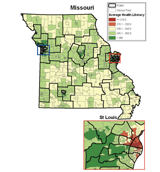 The foundation states that, “The maps described [in this report] provide an important step towards advancing action on health literacy in the state of Missouri. However, to be maximally effective, they must be used in concert with an understanding of the demographic distribution of the area and how low health literacy may affect their health and quality of care.” Historic segregation of suburbs and poor urban housing projects in many American cities has exacerbated poor health outcomes in low-income communities, specifically because these areas experience a lack of public service and supportive infrastructure.