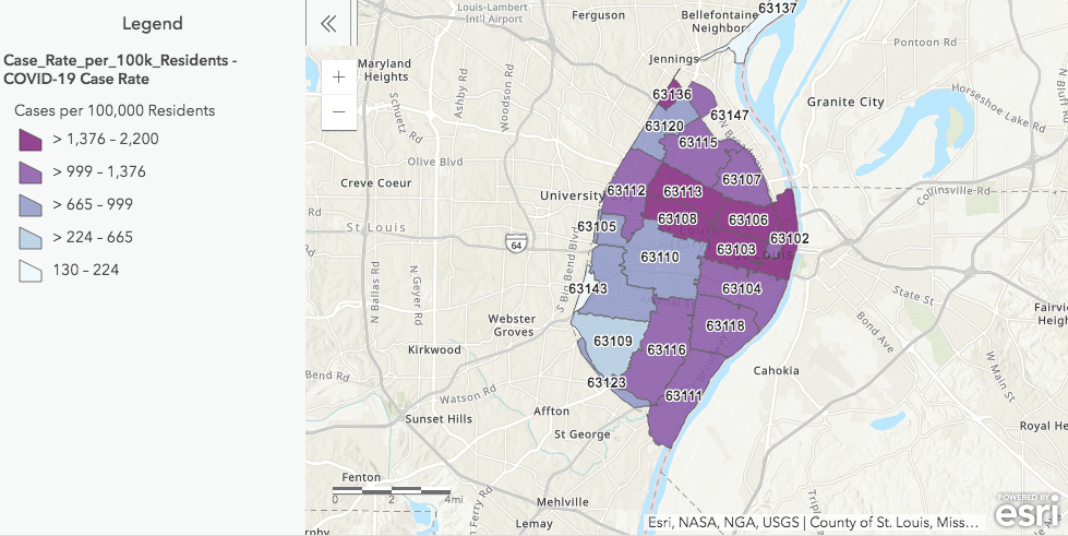 The provided data affirms that the highest number of cases exist in low-income communities with limited health literacy rates and lower socioeconomic statuses; COVID-19 is another manifestation of the location-based health inequalities that St. Louis has historically encountered.