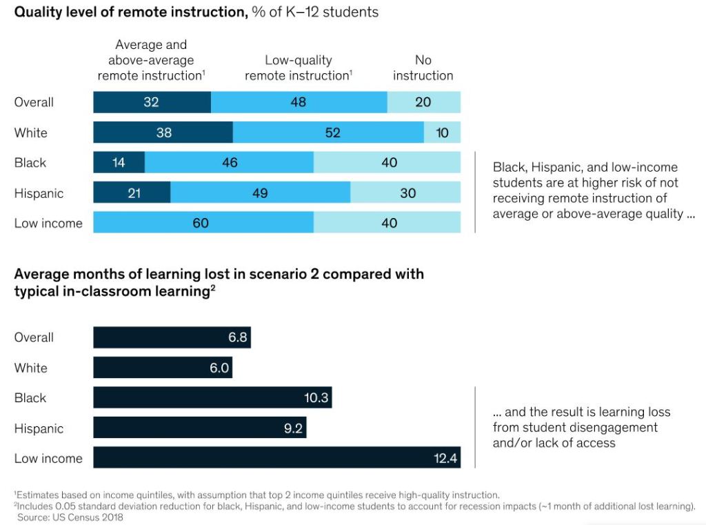 However, this transition won’t look the same for all students. In a county with over 141 elementary schools and 187,000 students, the socioeconomic diversity of students cannot be understated. With varying degrees of access to high-speed internet, portable and mobile technology, as well as support for individual learning, such as online tutoring at home, the achievement gap between students is bound to increase during the COVID pandemic. A study recently conducted by McKinsey & Company found that in the case of low-income students who were unable to return to school until the spring, nearly 60% of students would be unable to receive even average quality remote instruction. Directly due to this, low-income students would lose nearly a year of learning when compared to typical in-classroom learning, resulting in a 15-20% increase in the achievement gap.